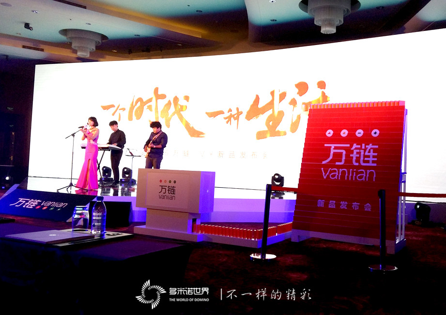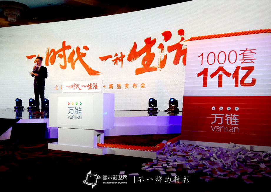 2016年7月20日,作為國內(nèi)較大房地產(chǎn)開發(fā)商萬科和著名地產(chǎn)服務(wù)商鏈家共同組建的家裝公司,萬鏈“一個時代·一種生活2016萬鏈V+新品發(fā)布會”在北京成功舉辦。主辦方特別邀請多米諾世界團隊,用新穎時尚的多米諾啟動儀式推出V+產(chǎn)品,當五位嘉賓共同啟動插卡機關(guān),骨牌瀑布般滑落,顯現(xiàn)出V+產(chǎn)品已成交千套,金額過億的信息時,引發(fā)現(xiàn)場轟動。