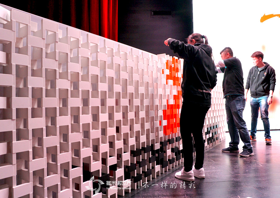 幾位嘉賓共同完成了最后幾枚特制啟動骨牌的碼放,并和現(xiàn)場來賓一共見證了,骨牌墻后“無畏變革,一起2“主題畫面的噴薄而出,現(xiàn)場氣氛瞬間達(dá)到高潮。