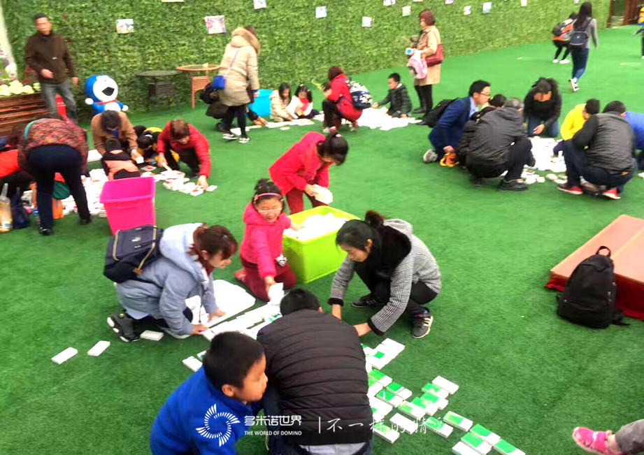 本次比賽也是親子賽,由孩子和家長(zhǎng)共同完成。所有家族被分別四組,每組碼放一幅圖案。每枚骨牌上都是圖案的一部分,所以要先將骨牌像拼圖一樣拼出完整畫面,然后再按要求完成碼放,最后要做到觸及一枚骨牌,圖案完全呈現(xiàn),才算成功。