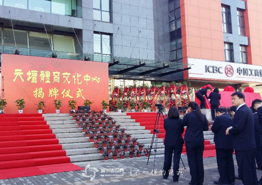 2017年3月31日,多米諾世界團(tuán)隊(duì)辦公所在地正式更名為“天壇體育文化中心”,中關(guān)村科技園及東城區(qū)的相關(guān)領(lǐng)導(dǎo)參與了中心的揭牌儀式,并到中心的特色文化體育單位進(jìn)行參觀。多米諾世界團(tuán)隊(duì)在辦公室搭建了一個(gè)精巧、簡(jiǎn)潔的多米諾歡迎儀式,迎接來賓。