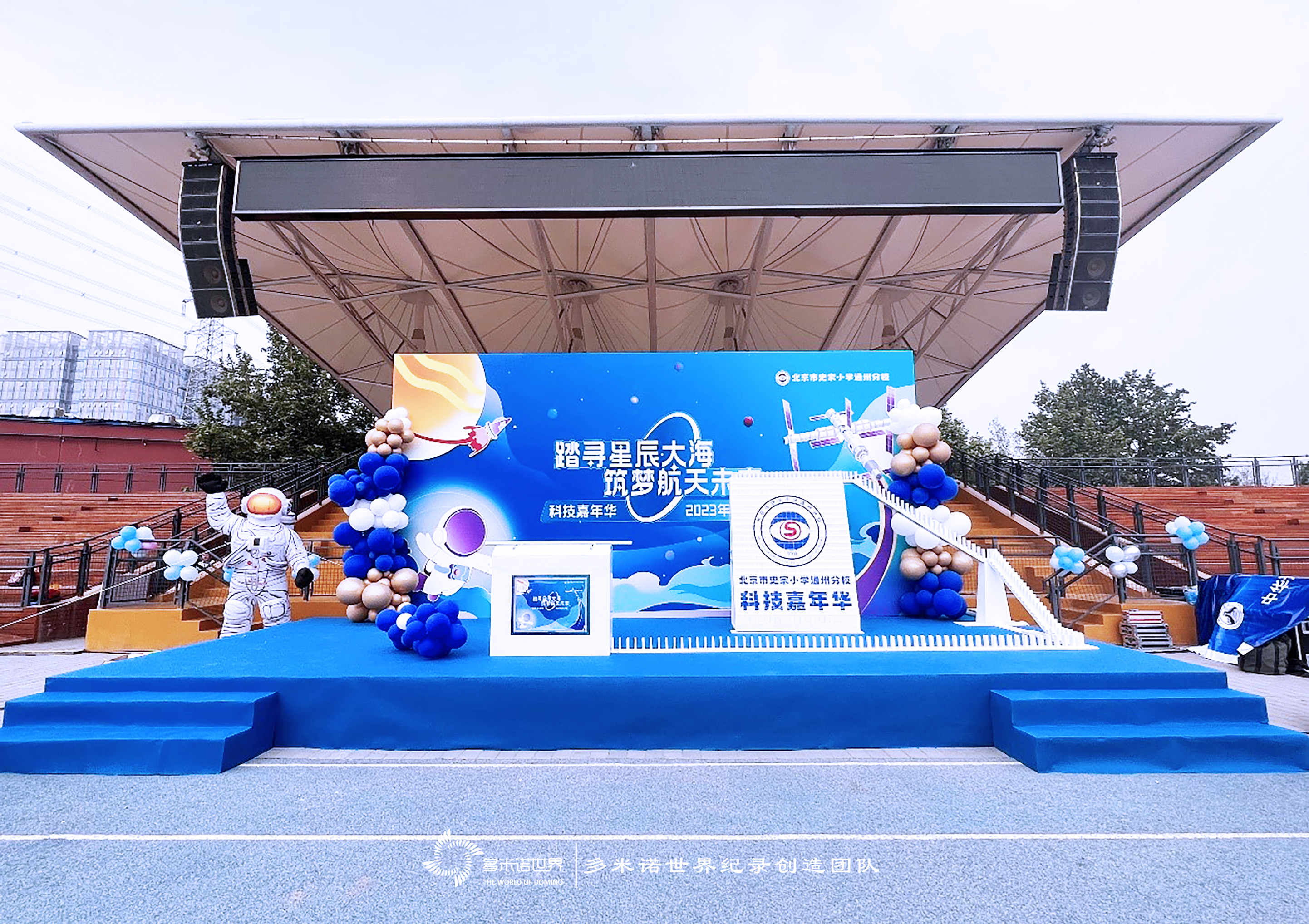 2023年5月11日,史家小學(xué)通州分校科技嘉年華如期舉行,3000余名師生齊聚體育場,本次嘉年華活動特別設(shè)計(jì)了多米諾骨牌啟動儀式,伴隨著校領(lǐng)導(dǎo)共同啟動推桿裝置,骨牌沿著主線行進(jìn)攀爬至樓梯,?;蘸涂萍技文耆A的畫面瞬間展現(xiàn)為科技嘉年華主題海報,活動正式開始,學(xué)生們積極投入到各項(xiàng)體驗(yàn)活動中。