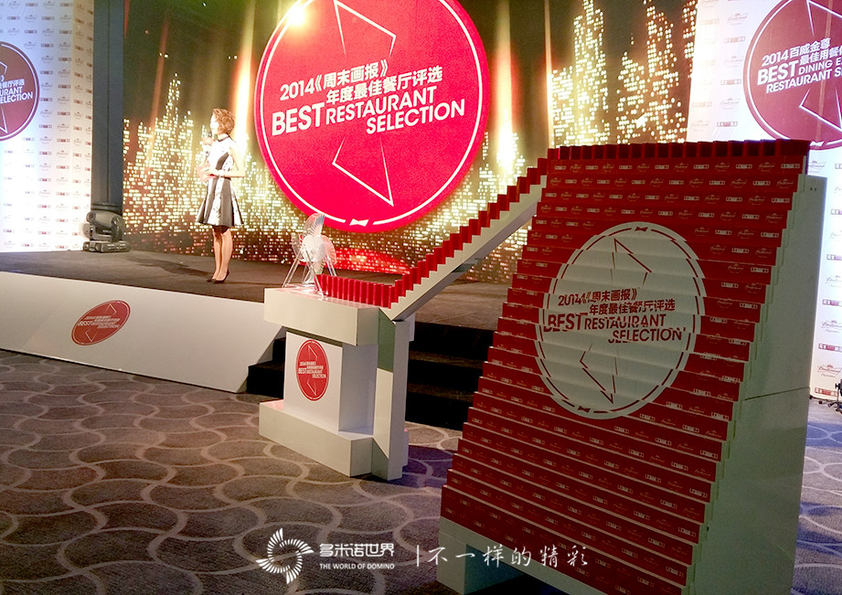 2015年02月05日下午,由現代傳播集團攜旗下《周末畫報》 “2014年度最佳餐廳評選”在北京新世界酒店隆重舉行,多米諾世界為活動設計實施了精彩的多米諾啟動儀式,北京眾多知名餐廳的掌門人與美食家齊聚一堂,共同見證了年度最佳餐廳的誕生。